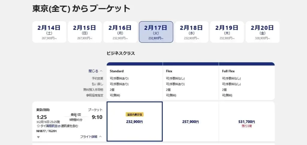 羽田~プーケットのビジネスクラスの通常費用は?